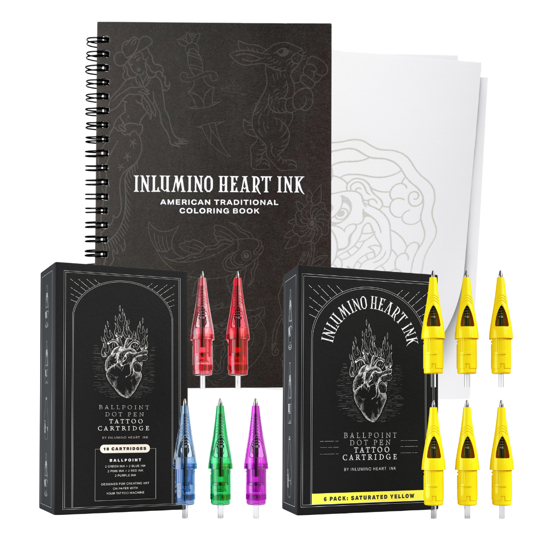 This bundle pairs our patented cartridges with our American Traditional Coloring Book, giving you 40 original designs to create, shade, color, and stipple with precision on paper.
