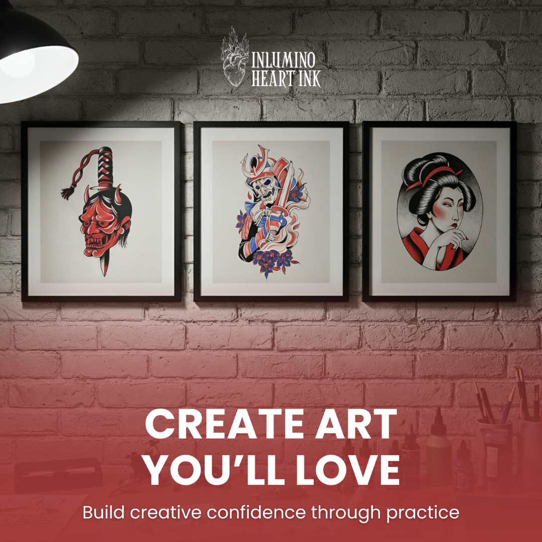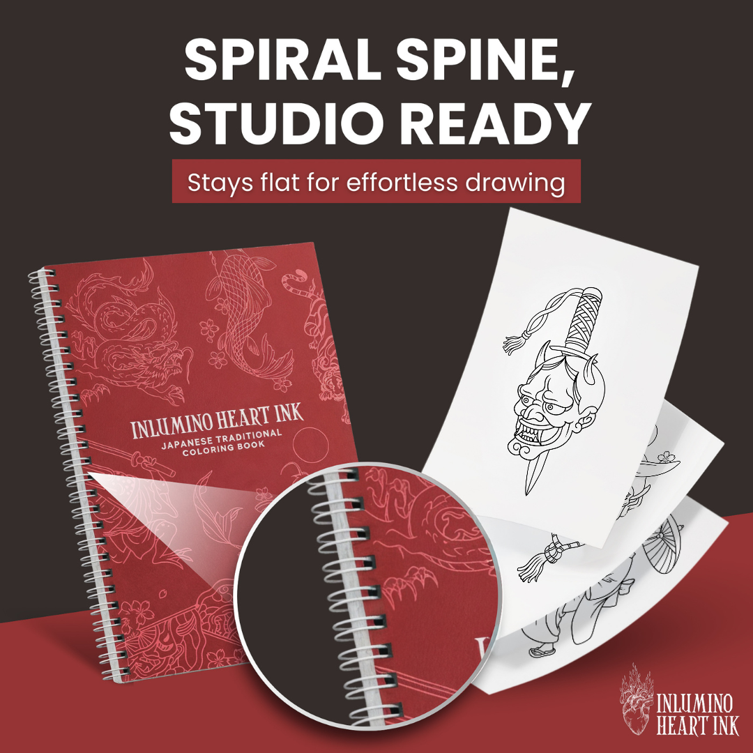 Designs have 100% opacity for beginners to practice shading and enjoy coloring in designs. This compact 8.5" x 5.5" book features 40 bold, hand-drawn Japanese Traditional designs—perfect for tattoo practice, art exploration, or relaxing creative time. All designs are pre outlined.