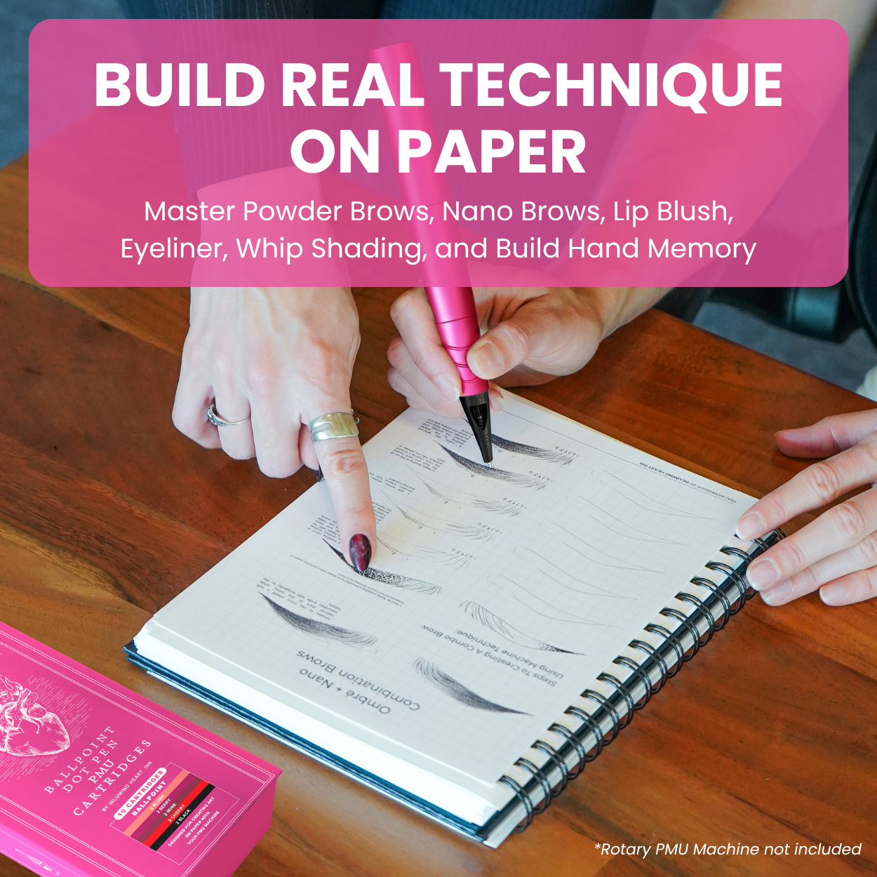 The PMU Workbook guides you through structured exercises, from shaping brows and practicing eyeliner strokes to building consistency and confidence in your artistry. Paired with the PMU Ballpoint Cartridges, you’ll get the tactile feedback of working with a real machine setup while practicing safely on paper.
